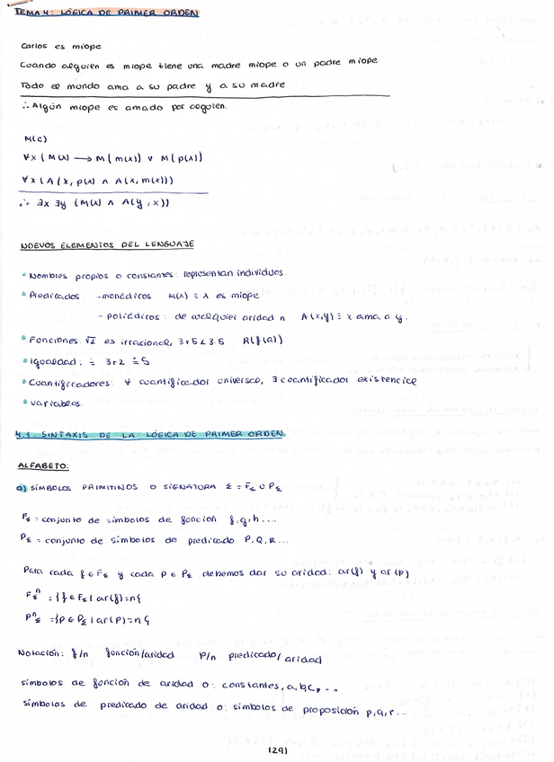 Resumen de la teoría de lógica de primer orden, tratando de manera fácil de entender y muy resumida toda lo que necesitas saber para los ejercicios.