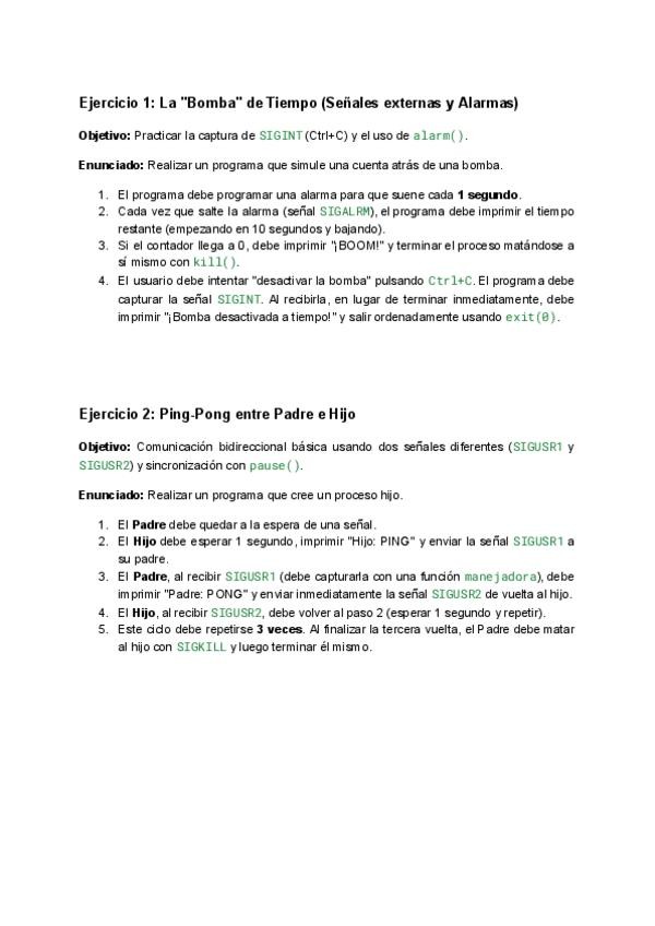 Ejercicios muy completos que requieren todo lo detallado en el Tema 1: Procesos y señales, ideales para practicar de cara al examen.