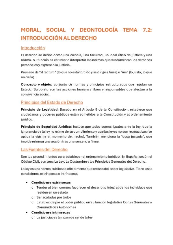 Apuntes tema 7.2: MORAL, SOCIAL Y DEONTOLOGÍA TEMA 7.2 INTRODUCCIÓN AL DERECHO