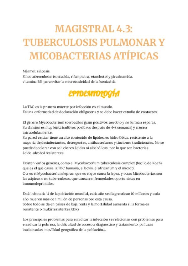 He publicado nuevos apuntes de 4º Sistemas de provisión, procesamiento y eliminación 5. La respiración y el aparato respiratorio: MAGISTRAL-4.3-TUBERCULOSIS-PULMONAR-Y-MICOBACTERIAS-ATIPICAS.pdf