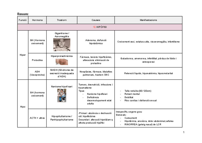 Taula resum dels trastorns endocrins, les causes i les manifestacions hormonals tant en hipofunció com en hiperfunció.