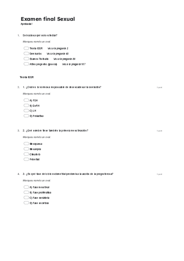 Simulación de preguntas tipo test del examen de Salut Sexual, que abarca todo el temario y los seminarios. Incluye un enlace a un formulario de Google Forms para que puedas practicar y autoevaluarte de forma interactiva.