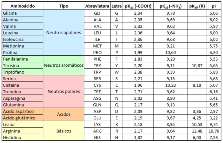 Os subo una tabla con los valores de todos los AA que vemos en bioquímica I con sus respectivos pka y pI