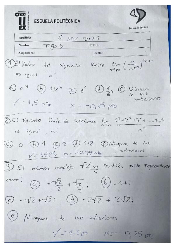 Un tipo de examen parcial de Cálculo de la evaluación continua del curso 2025/26.