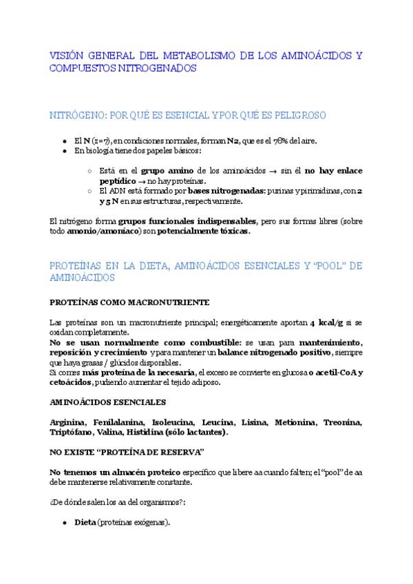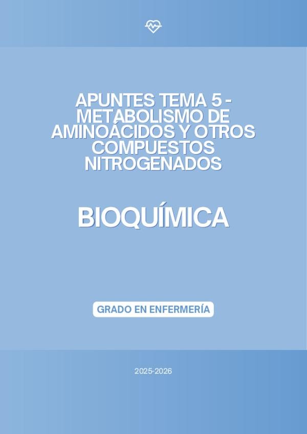 En este documento se encuentran los apuntes del tema 5 "Metabolismo de aminoácidos y otros compuestos nitrogenados" de la asignatura de Bioquímica del Grado en Enfermería del curso académico 2025-2026