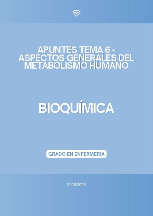 En este documento se encuentran los apuntes del tema 6 "Aspectos generales del metabolismo humano" de la asignatura de Bioquímica del Grado en Enfermería del curso académico 2025-2026