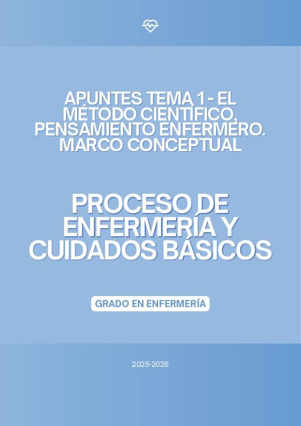 En este documento se encuentra el tema 1 de la asignatura "Proceso de Enfermería y Cuidados Básicos" del Grado en Enfermería de la profesora Marta López Bueno, del curso académico 2025-2026