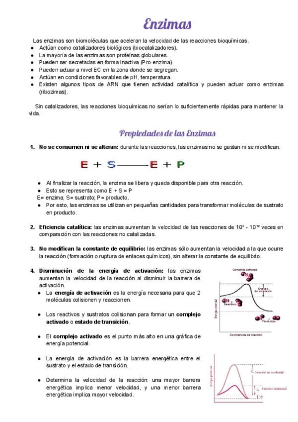 Apuntes detallados sobre Enzimología. El documento los siguientes puntos: • Definición y Propiedades: Naturaleza proteica, eficiencia catalítica y ribozimas. • Energía de Activación: Explicación de cómo las enzimas aceleran las reacciones. • Cinética Enzi