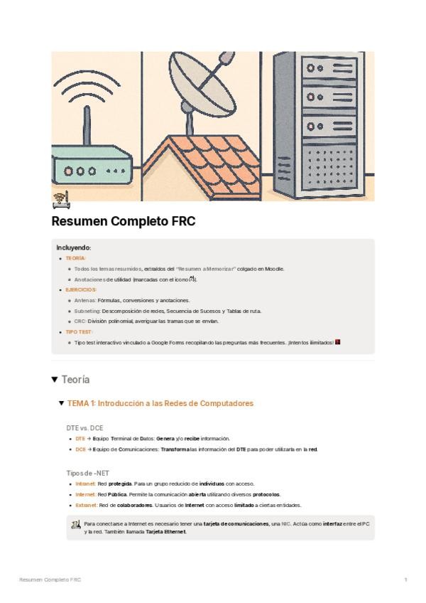 INCLUYENDO: - TEORÍA: Todos los temas resumidos, extraídos principalmente del "Resumen a Memorizar" de Moodle, añadiendo algunas pinceladas extras. - EJERCICIOS: Formulario y conversiones para ejercicios de Antenas, y Descomposición de subredes, Secuenc