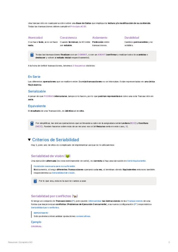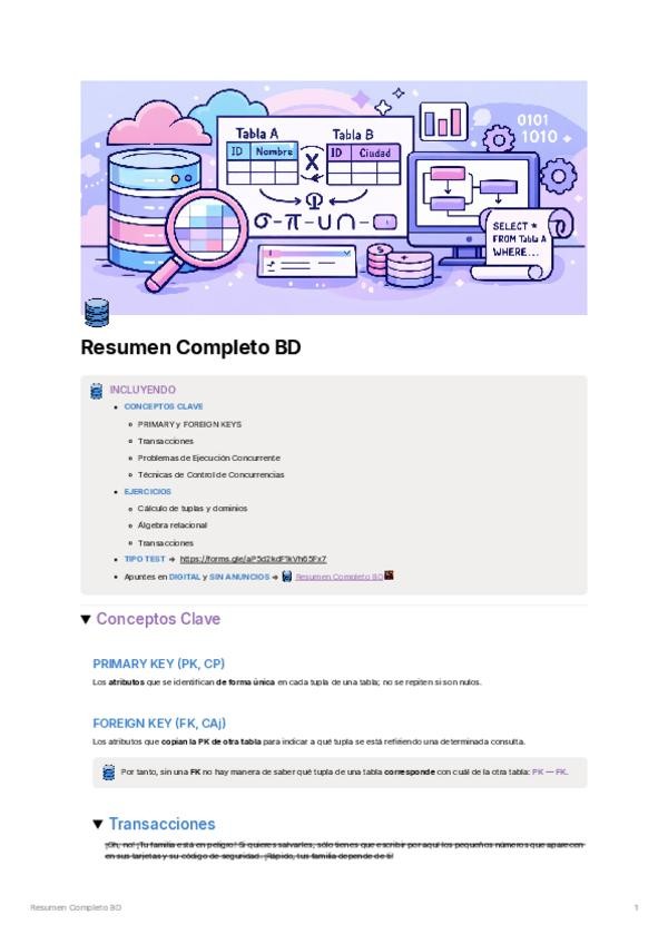 INCLUYENDO: CONCEPTOS CLAVE - PRIMARY y FOREIGN KEYS - Transacciones - Problemas de Ejecución Concurrente - Técnicas de Control de Concurrencias EJERCICIOS - Cálculo de tuplas y dominios - Álgebra relacional - Transacciones