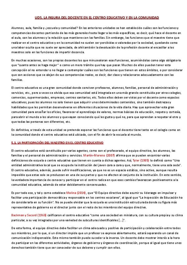 Resumen completo de la UD5 (La figura del docente en el centro educativo y en la comunidad) de la asignatura Funciones Docentes y Competencias del Maestro
