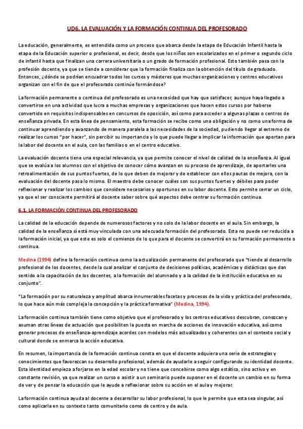 Resumen completo de la UD6 (La evaluación y la formación continua del profesorado) de la asignatura Funciones Docentes y Competencias del maestro
