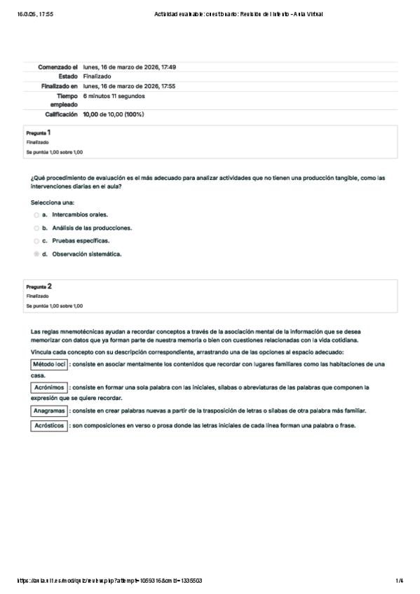 Preguntas y respuestas correctas (se puede ver la nota final: 10) del cuestionario evaluable de la asignatura Aprendizaje y Enseñanza. Universidad Isabel I. Máster Formación del Profesorado.