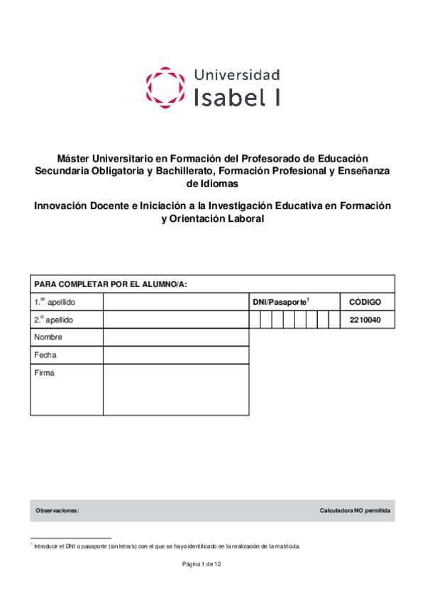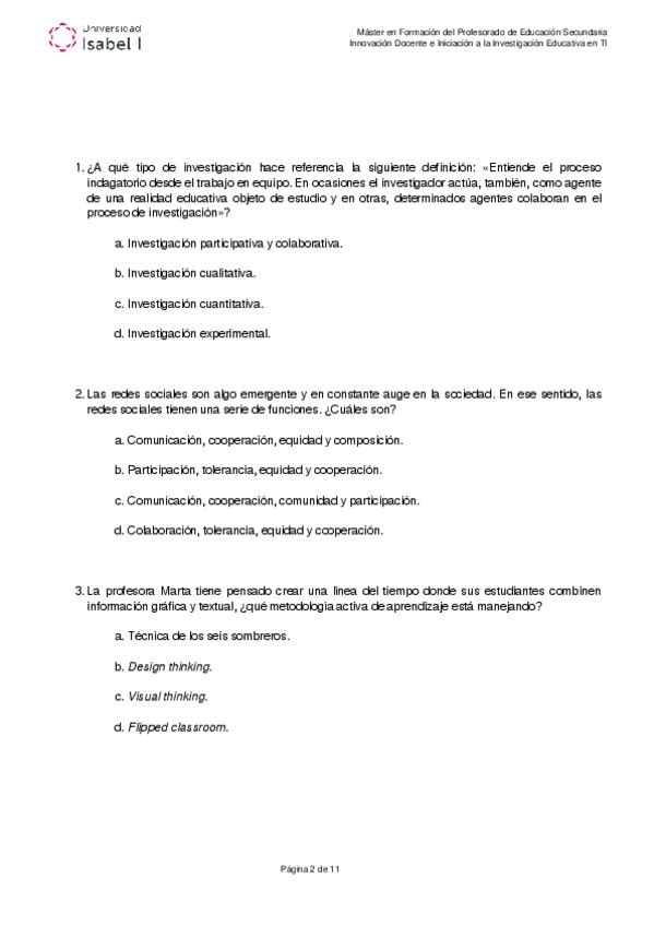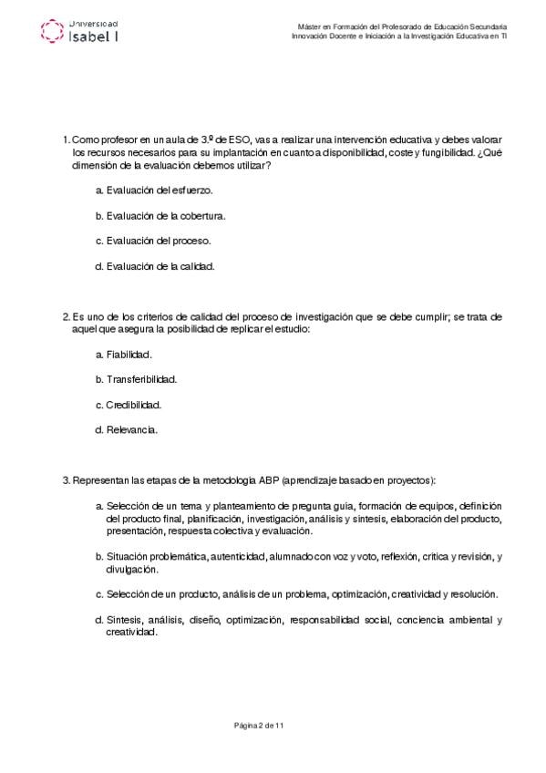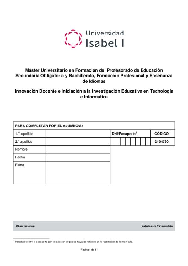 Examen oficial de la asignatura Innovación e Investigación docente. Máster formación del profesorado. Universidad Isabel I.