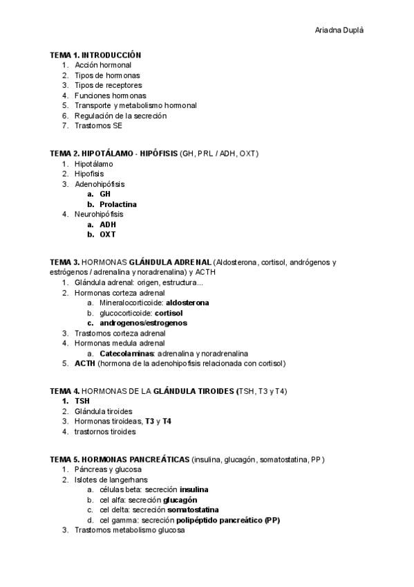 Resumen de las hormonas que aparecen en los temas 1-6 del sistema endocrino, tipo de hormona, receptores.