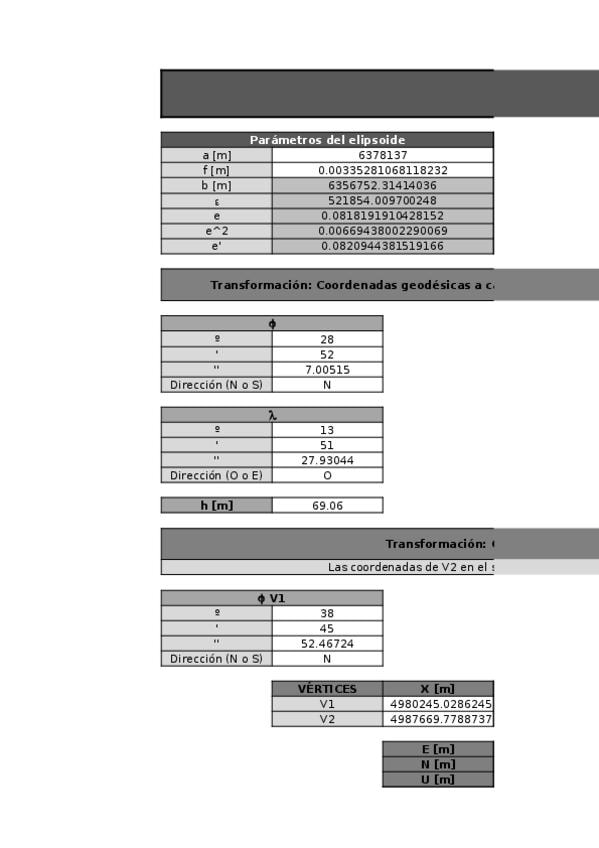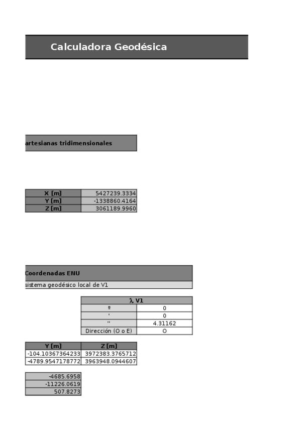 Transformaciones instantáneas de coordenadas cartesianas a geodésicas y viceversa. También coordenadas al sistema ENU. Sirve como ayuda en el examen final.