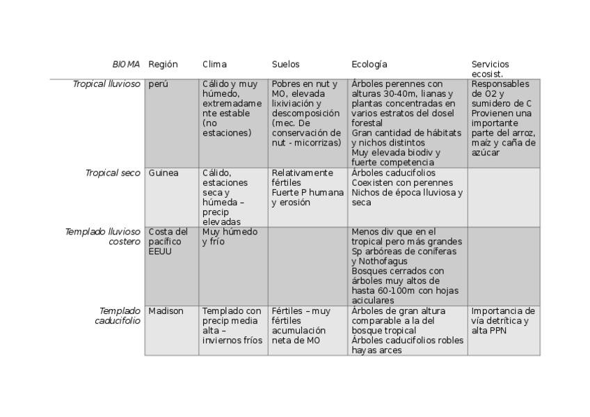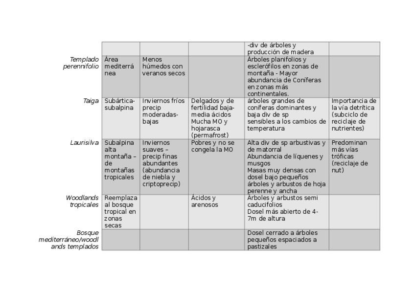 Tema 6 muy resumido (lo esencial que se suele preguntar; los tipos de biomas) Tabla con características de cada bioma, sacado del temario.