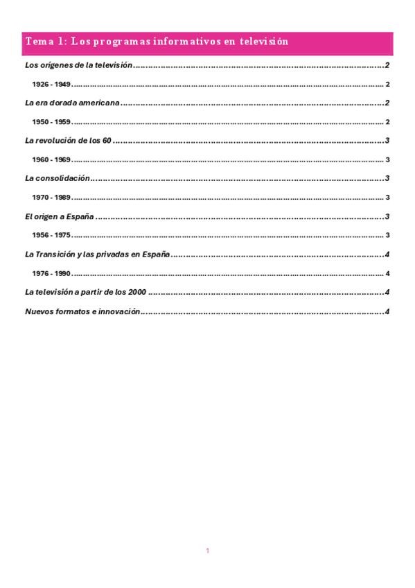 Apuntes muy completos de todos los temas (1-14) de Información Televisiva. Hay lecturas en los últimos temas y son de fácil estudio y entendimiento, contiene ejemplos, comentarios en azul, tablas y elementos destacados para facilitar el estudio y la compr