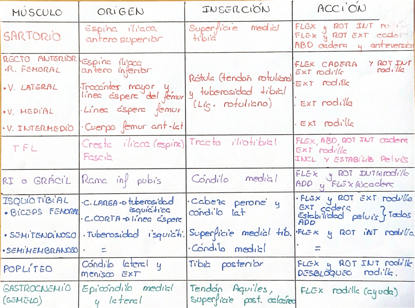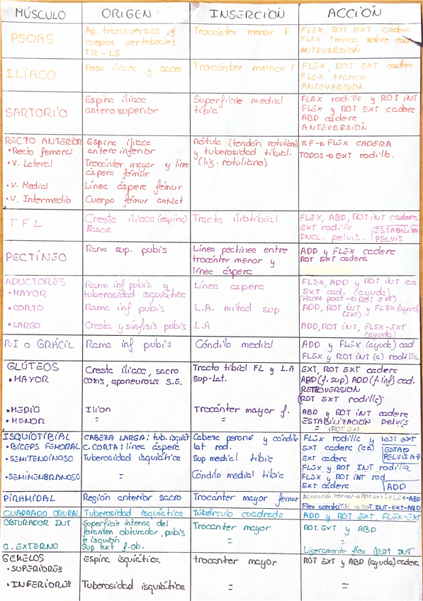 Tabla del origen, inserción y acción de los músculos de la Extremidad Inferior