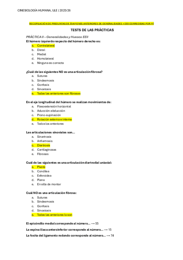 Recopilación de preguntas de tests corregidas una a una por mi (comprobadas con el kapandji + información de aulas teóricas), aquellas que tienen la respuesta en amarillo son 100% correctas. He aprobado el exámen con esto.