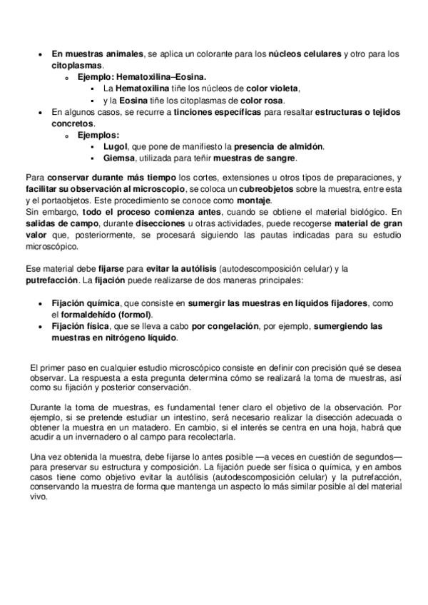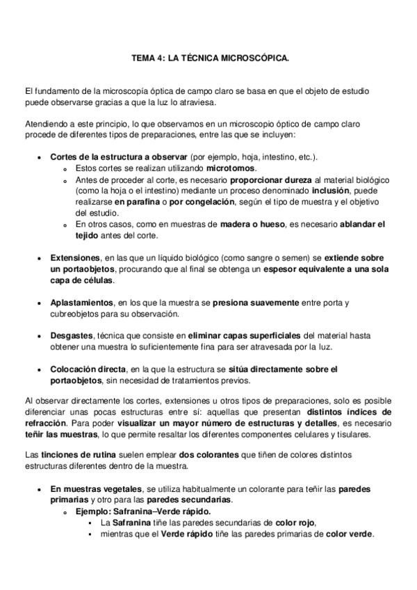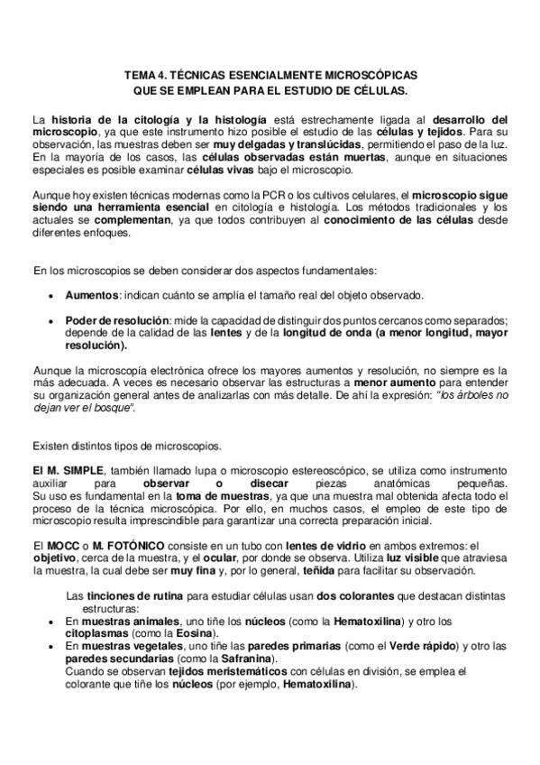Resumen tema 4 BC: TÉCNICAS ESENCIALMENTE MICROSCÓPICAS QUE SE EMPLEAN PARA EL ESTUDIO DE CÉLULAS.