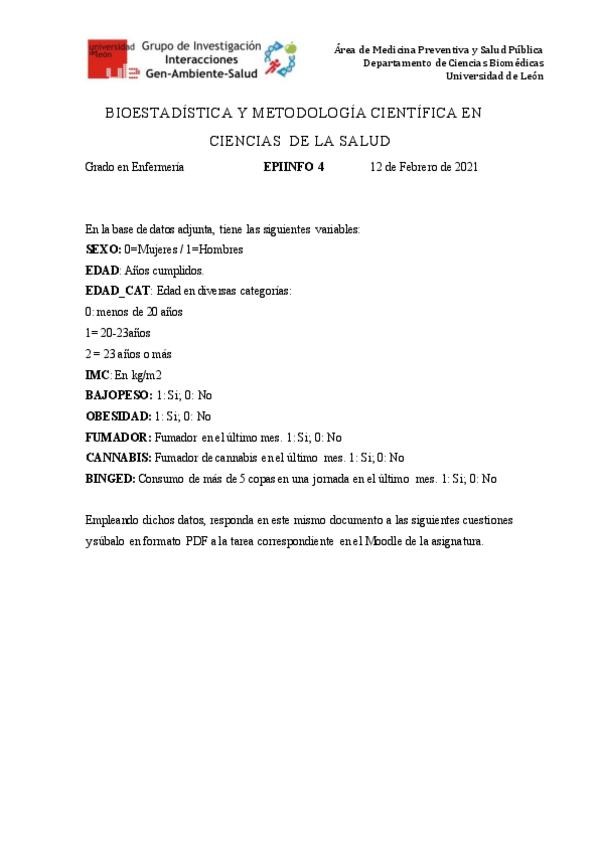 He publicado nuevos examenes de 1º BIOESTADÍSTICA Y METODOLOGÍA CIENTÍFICA EN CIENCIAS DE LA SALUD: Examen-Epiinfo-2021-febrero.pdf