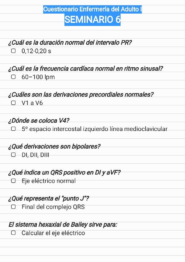 Cuestionario del seminario 6 de enfermería del adulto, preguntas rescatadas para exámenes.