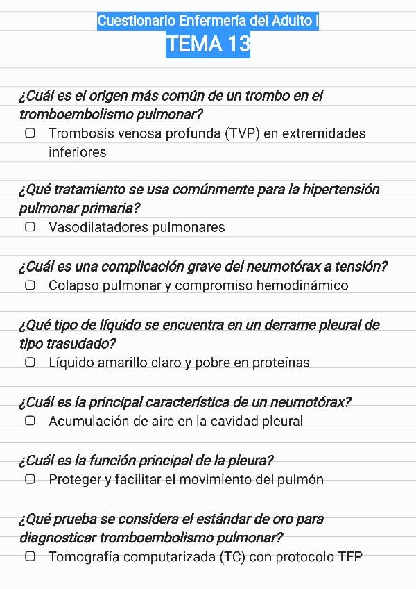 Cuestionario del tema 13 de enfermería del adulto, preguntas rescatadas para exámenes.
