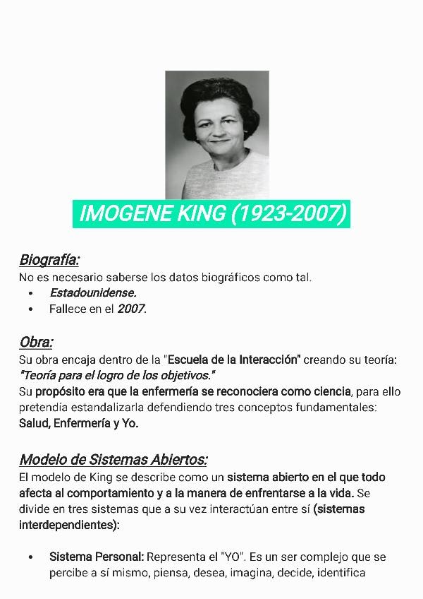 Resumen de los modelos de las segundas dos teóricas, Imogene M.King y Callista Roy, solo lo mencionado en clase. Incluye tablas, esquemas, mapas mentales y posibles preguntas del examen (*).