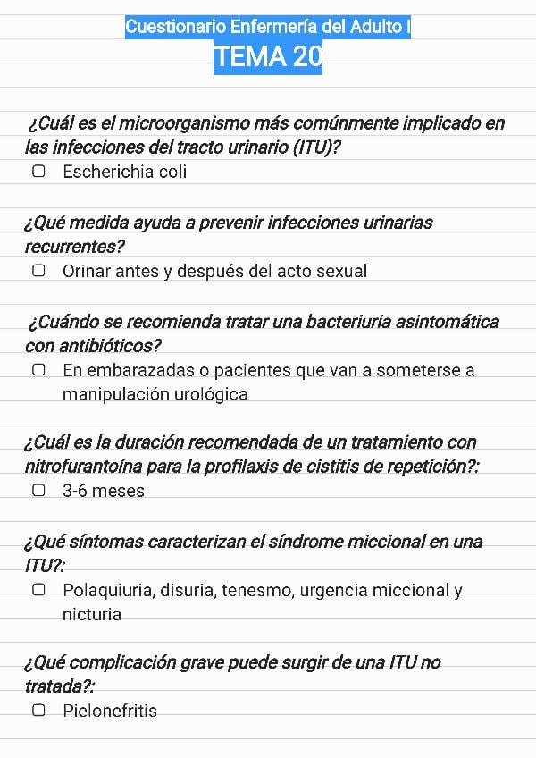 Cuestionario del tema 20 de enfermería del adulto, preguntas rescatadas para exámenes.