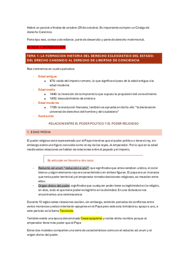 TEMA 1: La formación histórica del derecho eclesiástico del estado: del derecho canónico al derecho de libertad de conciencia