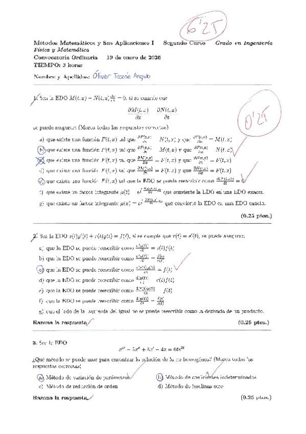 Examen Convocatoria Ordinaria 25-26 Métodos Matemáticos y sus Aplicaciones I (Corregido). Grado Ingeniería Física y Matemática (ULPGC).