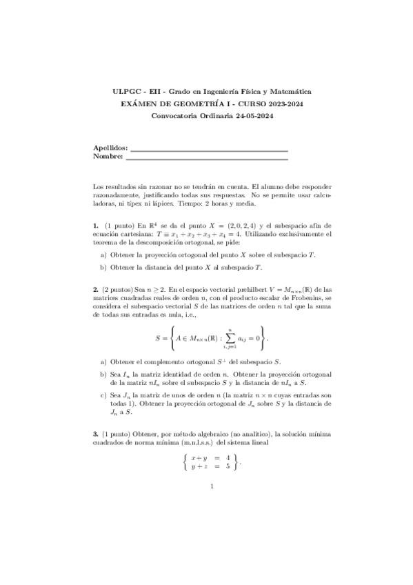 Examen Convocatoria Ordinaria de Geometría I 24/25. Con Solución. Grado en Ingeniería Física y Matemática (ULPGC).