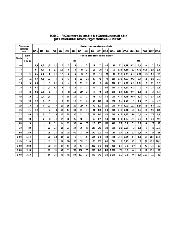 Tabla necesaria para realizar ejercicios de ajuste y tolerancias, puedes llevarla al examen.