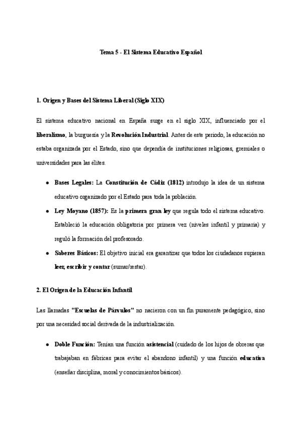 Los apuntes presentados corresponden al Tema 5 de Pedagogía de la AF y Deporte: el Sistema Educativo Español Actual. Están bien extensamente redactados y los conceptos están detalladamente explicados. A su vez, cada idea está desarrollada de manera clara