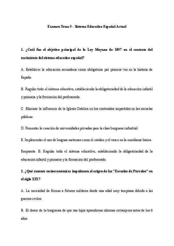 El siguiente examen aborda el Tema 5 de Pedagogía de la AF y Deporte: Sistema Educativo Español Actual. Las preguntas son súper exhaustivas, incluyendo algunas que los profesores ya han preguntado en exámenes pasados y que resultan de mayor relevancia.