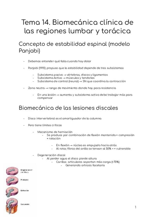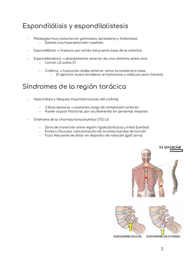 Concepto de estabilidad espinal, biomecánica de las lesiones discales, espondilólisis y espondilolistesis, síndromes de la región torácica, biomecánica del levantamiento de cargas, aplicación al deporte (efecto cizalla), análisis clínico del press de homb