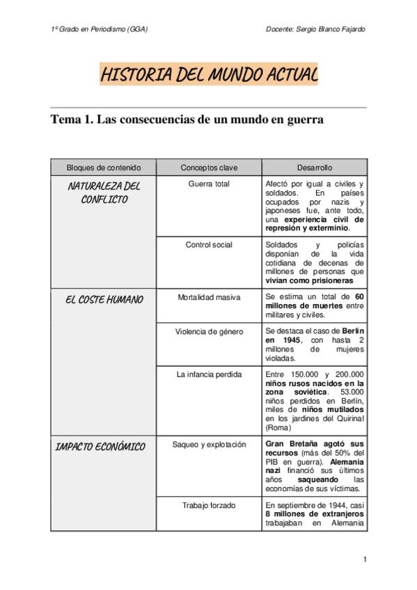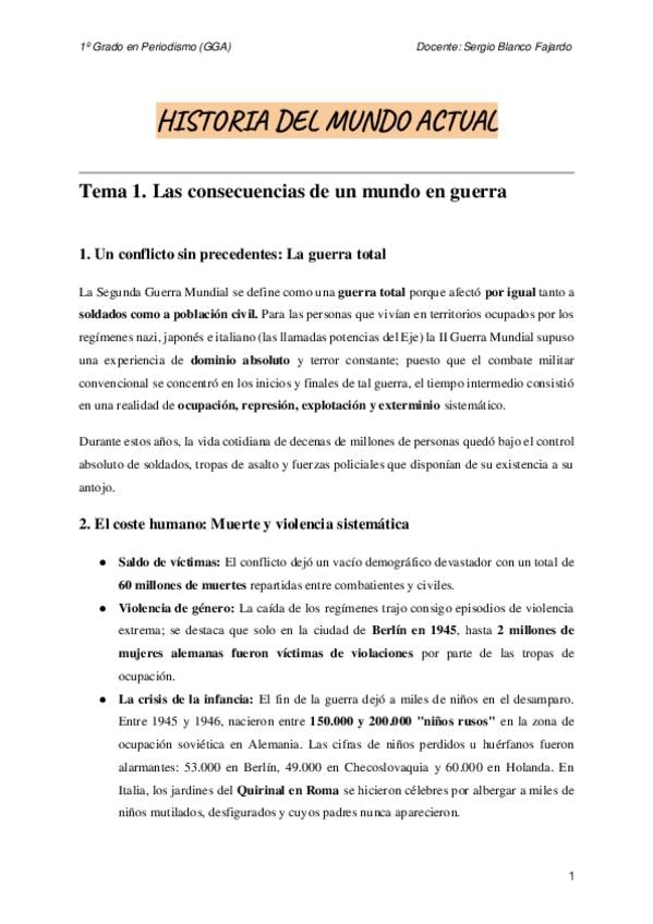 Desarrollo del Tema 1: Las consecuencias de un mundo en guerra de la asignatura Historia del mundo actual.