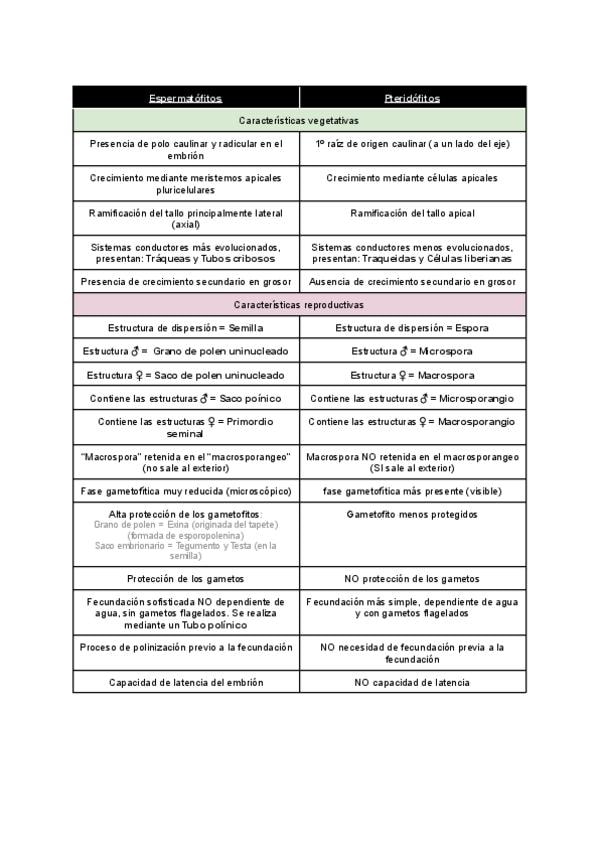 Tabla comparativa entre pteridófitos y espermatófitos, recogidas tanto las diferencias vegetativa como reproductivas