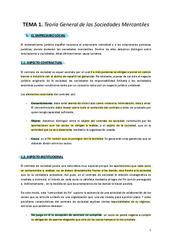 Apuntes de Derecho Mercantil de Sociedades subrayado. Incluye correspondencia en Ley de Sociedad de Capital de cada apartado del temario.