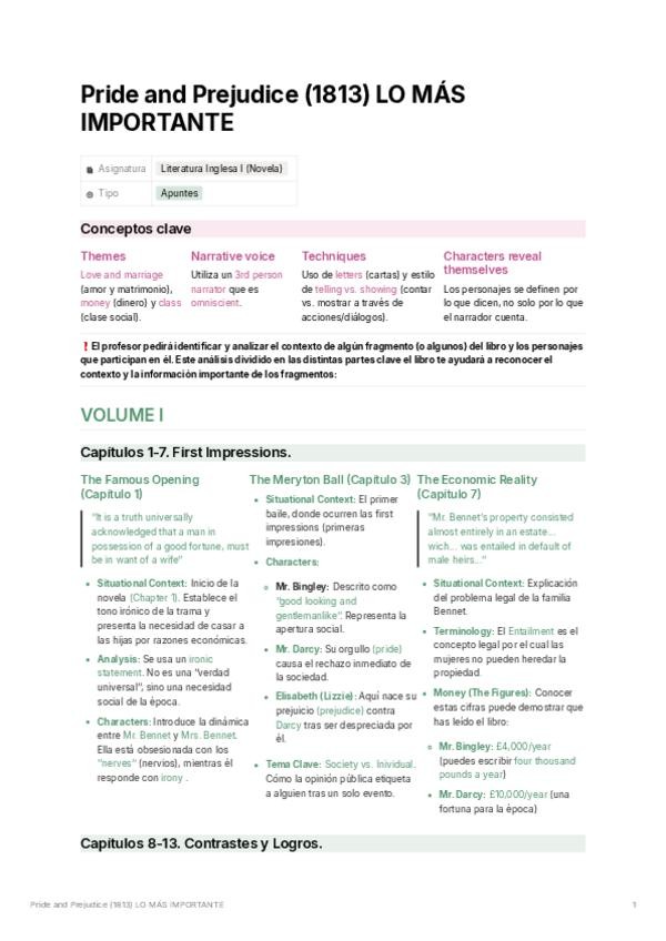 Resumen y análisis de los puntos claves de Pride and Prejudice basado en los PowerPoint de Manuel Hueso Vasallo.