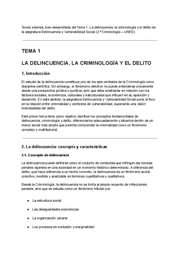 Teoría extensa, bien desarrollada del Tema 1: La delincuencia, la criminología y el delito de la asignatura Delincuencia y Vulnerabilidad Social (2.º Criminología – UNED).