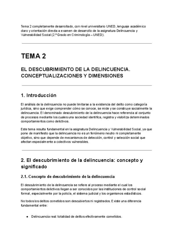Tema 2 completamente desarrollado, con nivel universitario UNED, lenguaje académico claro y orientación directa a examen de desarrollo de la asignatura Delincuencia y Vulnerabilidad Social (2.º Grado en Criminología – UNED).