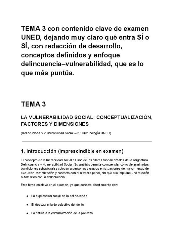 TEMA 3 con contenido clave de examen UNED, dejando muy claro qué entra SÍ o SÍ, con redacción de desarrollo, conceptos definidos y enfoque delincuencia–vulnerabilidad, que es lo que más puntúa