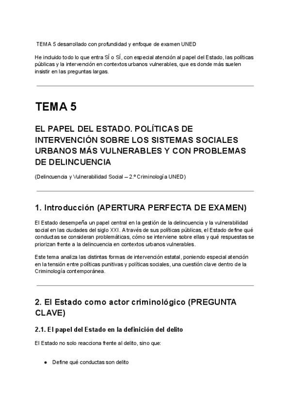 TEMA 5 desarrollado con profundidad y enfoque de examen UNED He incluido todo lo que entra SÍ o SÍ, con especial atención al papel del Estado, las políticas públicas y la intervención en contextos urbanos vulnerables, que es donde más suelen insistir en