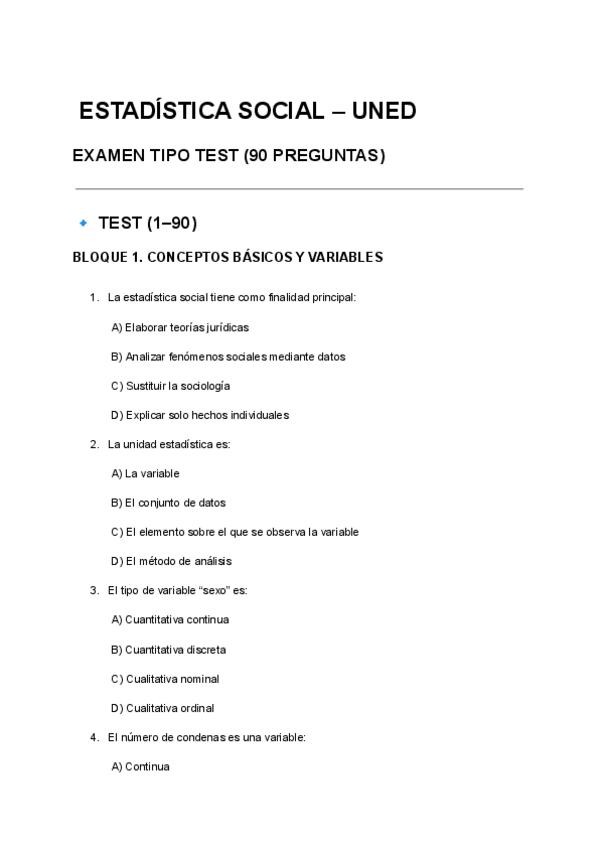 ESTADÍSTICA SOCIAL – UNED EXAMEN TIPO TEST (90 PREGUNTAS) CAEN SI O SI EN EL EXAMEN