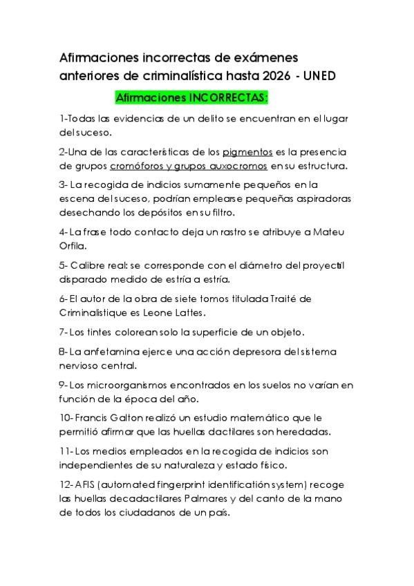 Afirmaciones incorrectas de Exámenes anteriores de criminalística hasta 2026-UNED, Grado en Criminolóogía, cuarto curso.