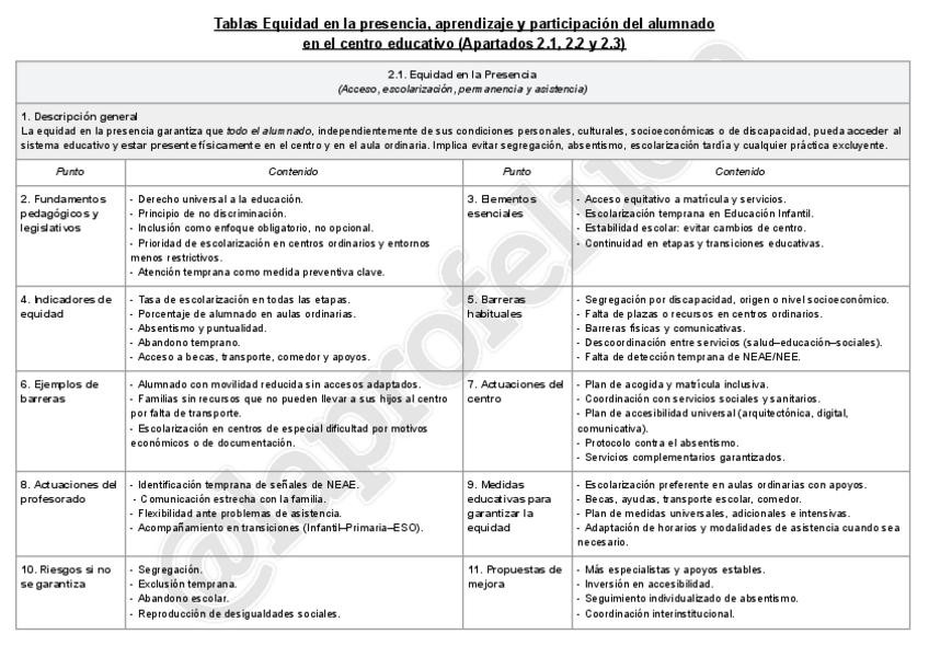 Tablas resumen apartados: Equidad en la presencia, aprendizaje y participación del alumnado en el centro educativo, Barreras y limitaciones y Principales colectivos vulnerables y con experiencias educativas más excluyentes