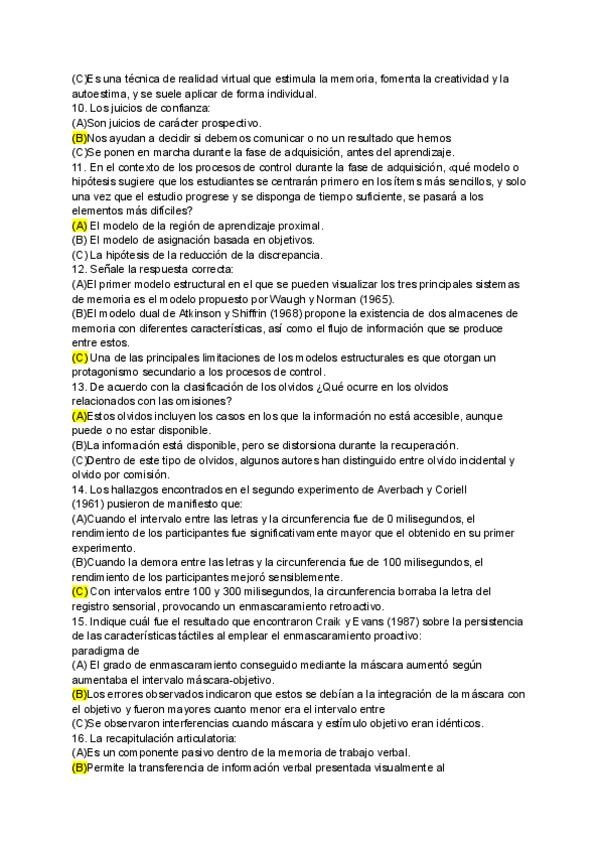 Examen de la semana de Enero de Psicología de la Memoria Uned con soluciones provisionales por alumnos con el temario.