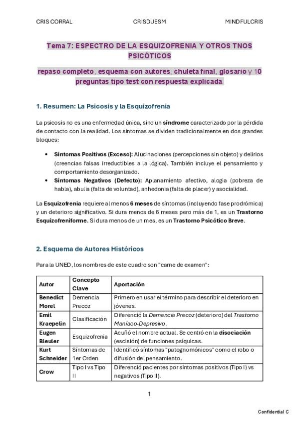 ESPECTRO ESQUIZOFRENIA. Esquema, autores, chuleta final, glosario y preguntas de test explicadas